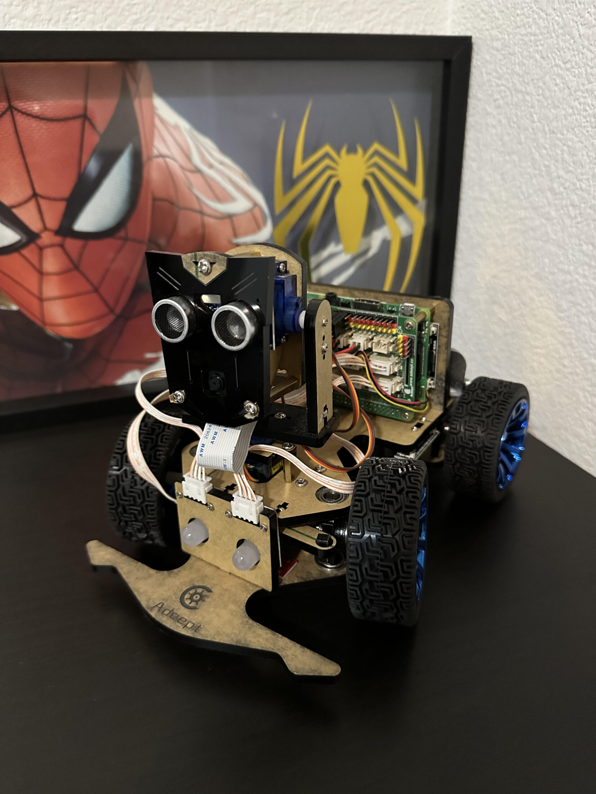 Pi Car was built using Raspberry Pi 3B. It contains 3 servo motors to control stationary movements and a stepper motor for wheel rotary movement. It also contains a number of input/output modules such as camera, motion sensor, temperature sensor, IR sensor, bluetooth, mic etc.